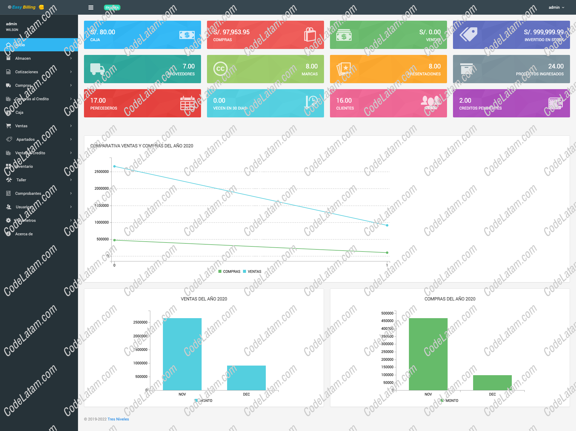 Productos: Gestión de todos los productos, considerando un nombre, código de barras, categoría, marca y presentación a la que pertenece, el stock en almacén, precio de compra, se considera hasta 3 precios de venta, se indica si el producto es sujeto a impuesto, es perecedero y si es inventariable.